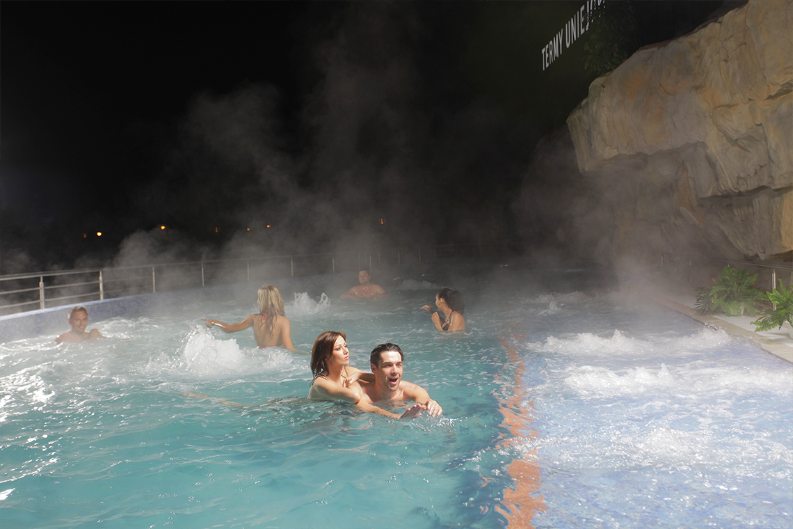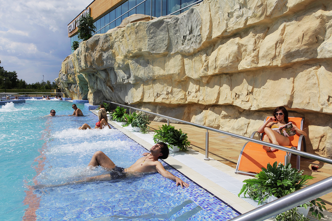 Basen duży solankowo-uzdrowiskowy jest połączony specjalnym przejście z basenem wewnętrznym i stanowi idealne miejsce do relaksu i wypoczynku. Do dyspozycji gości na basenie pozostają: