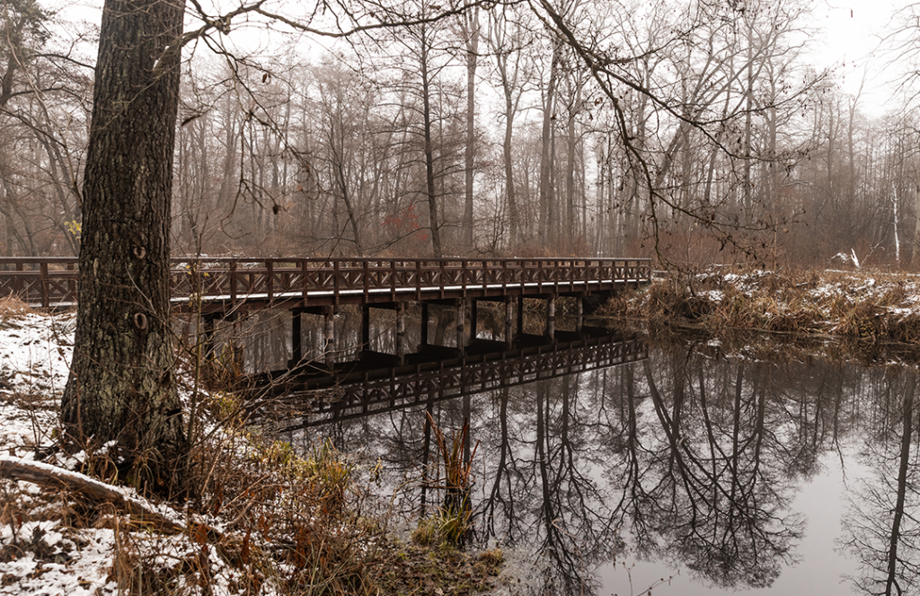 Na trasie spacerowej czekają m.in. platforma widokowa nad dawnym korytem rzeki, klimatyczne mostki, urocze kładki oraz makiety zwierząt, które szczególnie spodobają się najmłodszym. To idealne miejsce, by połączyć kontakt z naturą z aktywnym wypoczynkiem (także w zimowej, feriowej scenerii).